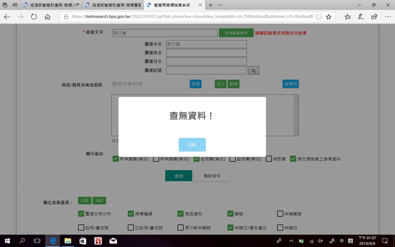 舉個最簡單的例子,到2019年09月初時,商標檢索系統上是查不到關於「歌仔戲」或「歌子戲」。
