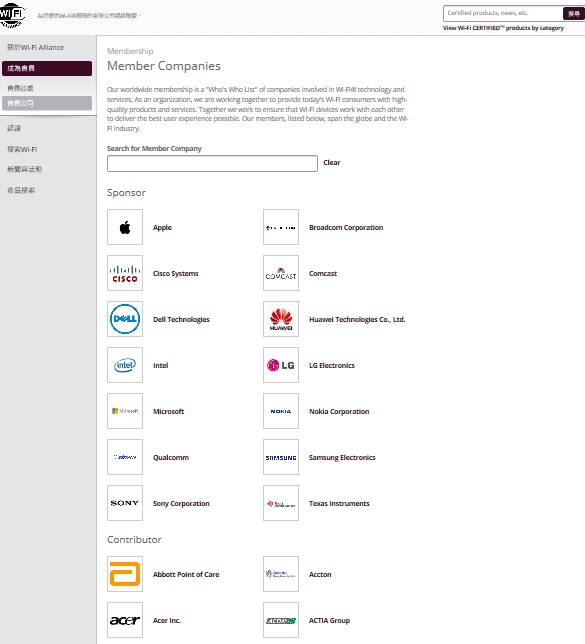 煩請重看圖一~圖三左側的標章權人的資料,它們的標章權人名字看起來都是私人單位而無政府色彩,再看下圖圖四的美商Wi-Fi聯盟網站[註3]中列在最上面的成員資料,裡面不得了居然有蘋果/英特爾/高通/三星等巨獸級廠商,所以這些廠商只能算是間接參與的角色,而非直接控制。