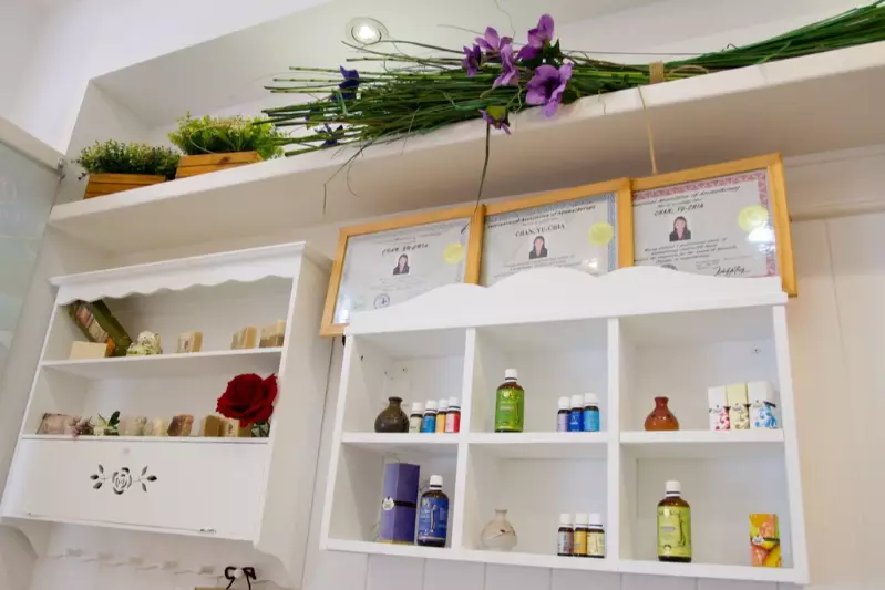 ▲境香氛 SPA 三峽北大店櫃台展示澳洲 TGA 等級精油,營造專業且溫馨的芳療空間氛圍(圖/Medick Marketing Ltd. 提供)