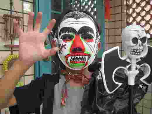下一步,我邀孩子在架上觀摩塑膠製的形形色色的面具,鬼鬼倒是容易,吸血鬼可要費點心囉!抹油梳得亮亮的髮尖,形似邪惡的鷹勾鼻,嚇人的犬牙,還有還有滿嘴的血跡哩!