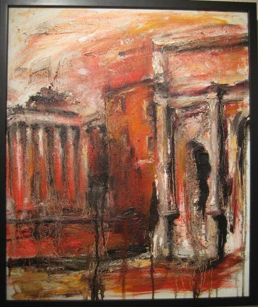 風景系列是她旅歐的成果。她很有感觸地說,再美好的人生總有谷底,英雄總會走入歷史,她任由顏料漫流,畫面多了濛濛意境-黃昏的羅馬競技場、秋詩篇篇的巴黎聖母院、月光下的威尼斯水波倒影…,巍峨的建築與典雅的古道,多少英雄淡出舞台,走入歷史,在她筆下,蒼茫間,猶不失偉大與價值。