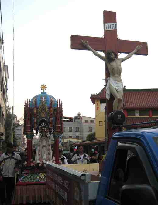 這時剛從一旁的大眾廟結束探訪古蹟的行程,穿過寺廟牌樓,迎面而來的是高聳入天的十字架,迎著聖母座轎在夕陽下慢慢地移動,隨行的是不同國籍的神職人員。剎時像到了異鄉。