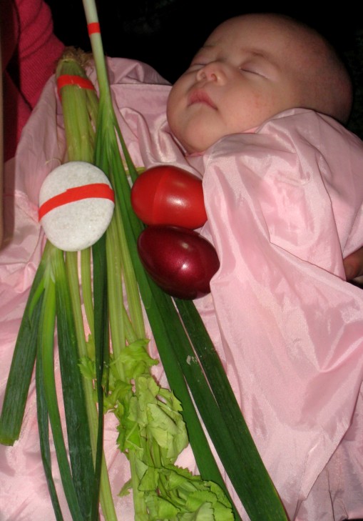 依照傳統禮俗,新生兒滿12天「剃頭」,嬰兒母親的「外家」利用此際為女兒做月子。現代人忙碌,很多禮俗都簡化了,凃家把「剃頭」和滿月酒一起辦了。小魚兒的頭髮製成胎毛筆象徵「發」,肚臍眼崁入印章裡是求「開運」與「財氣」。