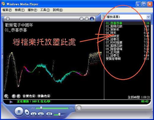 許多人安裝了 Windows XP 之後,一昧的去找尋燒錄程式來製作家用 CD 光碟片,卻不知道 XP 之下的媒體播放程式不失為一個很少失誤的 轉換程式。只要幾個輕鬆的步驟,就可以在短時間之內製作一張可以 在家用或是車上音響上欣賞聆聽 CD 音樂光碟。 使用方法 _首先開啟媒體播放程式:Windows Media Player,再利用檔案總管將放置在硬碟裡面的 MP3 檔案用滑鼠左鍵托放到播放清單之內,圖示如下: