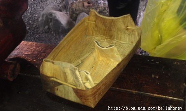 除了竹筒之外,把厚重的檳榔葉子摺成一個方形的鍋子,再插上竹籤固定,立刻就可以變成一個葉子鍋唷!煮魚湯或是煮青菜都很方便。