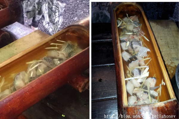 「蛇紋石」是一種可以耐高溫的石頭,把「蛇紋石」燒滾之後(高溫達五、六百度),先把魚肉、薑絲及清水放入竹筒之中,然後將燒熱的石頭過過開水、洗去灰塵,再丟入竹筒內。「蛇紋石」非常大,大約一、兩顆就夠了,石頭的高溫可以在極短時間內把魚肉煮熟。