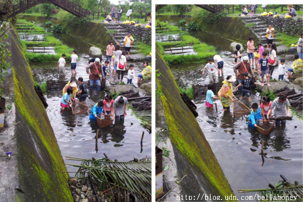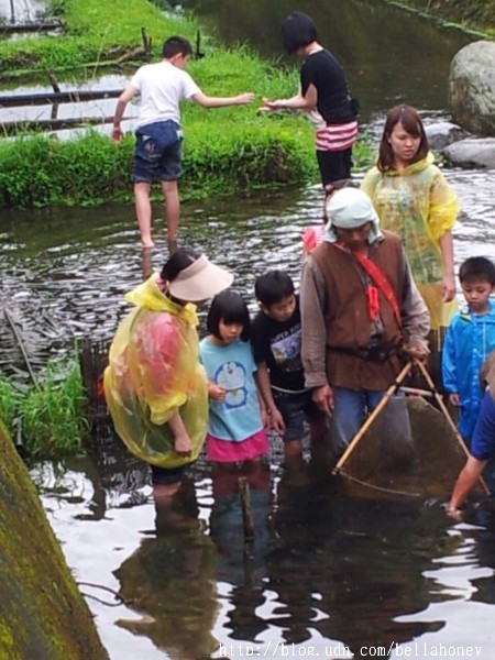 瞧我們一大群人紛紛脫掉鞋子、襪子,換上短褲或是捲起褲管,踩在冰冷的溪水裡摸蜆仔,以及體驗原住民傳統生態巴拉告捕魚法,也就是利用一個竹編的三角漁網在溪裡捕魚。