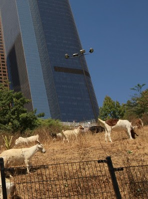 前幾天開車到洛杉磯市中心,經過4th和Hill Street的時候,看到一群山羊在歷史悠久的Angels Flight旁邊的斜坡上吃草。原來這群山羊是被雇來清理雜草的,只是他們都回收到自己的肚子裡了!