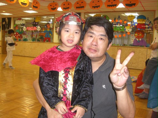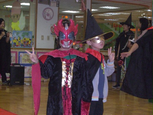 今天是萬聖節,9點半就開始整個派對活動,先是每一班的小朋友輪流走秀,一個個展示今天穿的服裝和面具,有超人、小公主、精靈、忍者龜、巫婆...等等不同的造型,芯羽寶貝今天的造型是蝙蝠女(其實去年也是啦~),有長長的黑裙和袖子,加上紅色大立領(不過因為尺寸的關係,領子立不起來,所以看起來沒那麼兇),面具是鄰居到夜市幫忙買的女超人面具,有點不搭,不過沒關係啦~看起來一樣可愛。