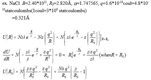 ex. NaCl B=2.401011, R0=2.820Å, =1.747565, q=1.610-19coul=4.810-10 statcoulombs(1coul=3109 statcoulombs)