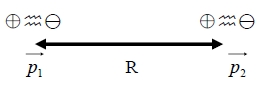 the interaction energy between two diploes, p₁, p₂, separated by R is given by
