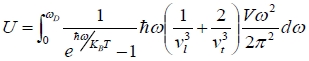U=∫₀ωᴅ[1/(eℏω/kᴃT-1)]ℏω(Vω²/2π²v³)dω for each polarization 1/vₗ³+1/vₜ₁³+ 1/vₜ₂³