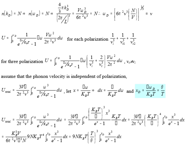 U=3Vℏ/2π²v³∫₀ωᴅ[ω³/(eℏω/kᴃT-1)]dω=3Vℏ/2π²v³∫₀xᴅ(kᴃT/ℏ)⁴[x³/(ex-1)]dx