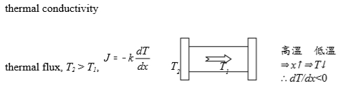 thermal flux, T2 > T1, J=-kdT/dx