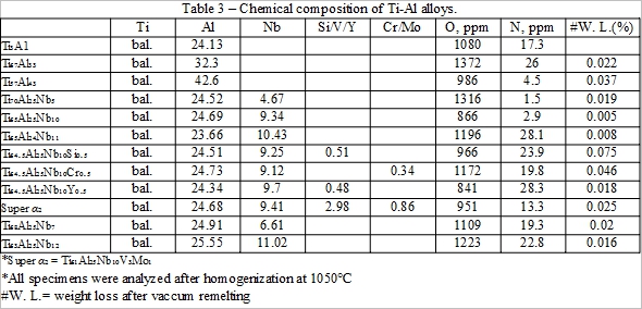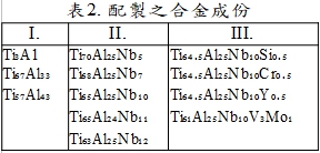 合金配製是以Ti₆₅Al₂₅Nb₁₀的成份為基準, 或添加微量的第四元合金元素, 或改變Ti-Al-Nb三元合金中的鈮含量, 並與Ti-Al合金相比較。上述合金成份如下表所列。