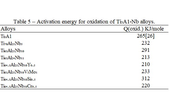 在Arrhenius圖中求其斜率即可得氧化所需之活化能, Qoxid., 列於表5, 添加Nb的Ti3A1合金, 其氧化活化能與Ti3A1合金比較, 隨Nb量的增加呈現先降後升的趨勢。類似鈦鋁合金的氧化活化能的變化, 在增加鋁含量時會使氧化加速, 降低氧化所需的活化能。G.Welsch認為這種現象是dopping的效應, 但添加Nb的Ti3A1合金是否如此, 則有待商榷。