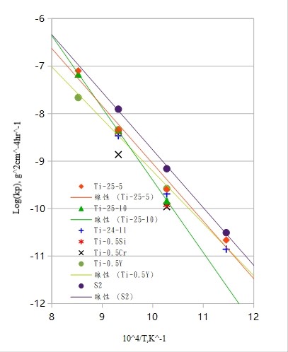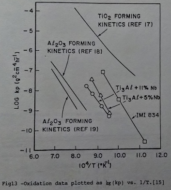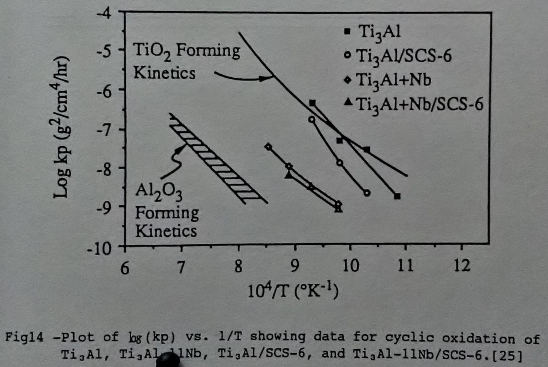 取對數, log(kₚ) 對溫度倒數(1/T)作圖, 即可得Arrhenius圖, 如圖43/44, 圖中右上及左下的直線各是氧化鈦及氧化鋁的形成動力學直線。Ti3A1合金的直線是較靠近氧化鈦的一邊, 而添加Nb之後, Ti3A1-Nb合金則向形成氧化鋁的方向靠近, 證明Nb的合金效應可以促使 A12O3生成, 亦可由前述的氧化層結構對照得知。