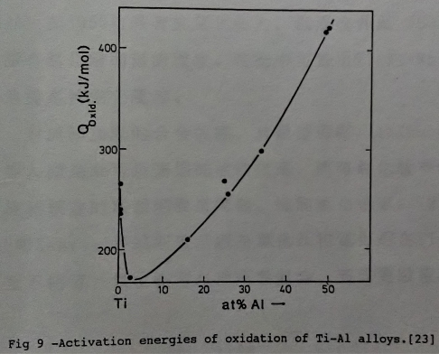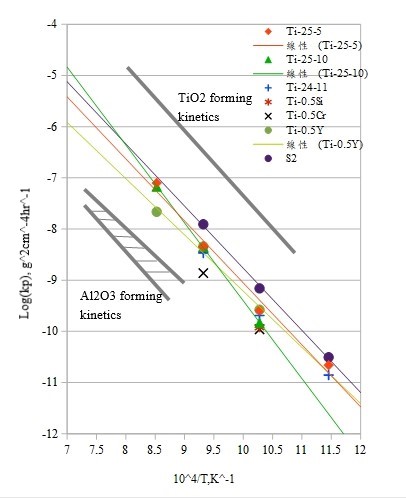 從Arrhenius圖(logkₚ vs. 1/T plot)去分析, 如圖8[23], 兩側的直線分別為TiO₂和A12O3的Arrhenius關係, 隨鋁的增加, 鈦鋁合金的線性向形成A12O3的直線靠近。