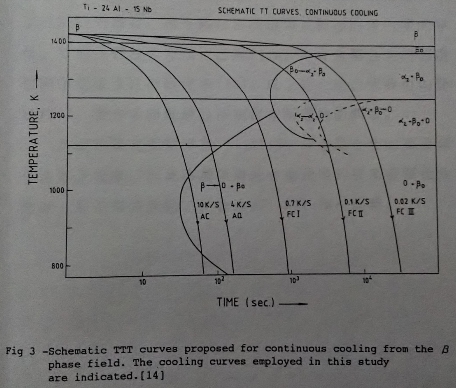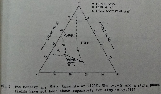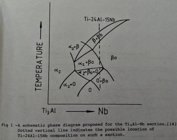 Ti3A1基介金屬合金的研究存有常溫脆性和高溫氧化的兩大問題。目前的研究大部分係以添加鈮(Nb)的鈦鋁介金屬合金作為主題。而添加鈮的合金效應, 在機械性質方面, 可使差排活性增加, 改善常溫的延性[8][9]。在一系列Ti3A1-Nb合金中, 已發現Ti65Al25b10成份的合金有較突出的延性, 特別是經過熱軋處理後延性更佳[10]。另外, Ti3A1-Nb合金的顯微組織也因鈮的關係變得較複雜; 除了主要的α₂(Ti3A1,DO19)和β(B2結構)兩相組成外, 還有o相[11](orthorhombic system, Cmcm)與准穩定(metastable)的ω相[12](B82結構)。這些相變化和熱處理過程之間的關係可藉Banerjee[13][14]等人提出的局部Ti3A1-Nb相圖與TTT曲線來說明。(如圖1/2/3所示)