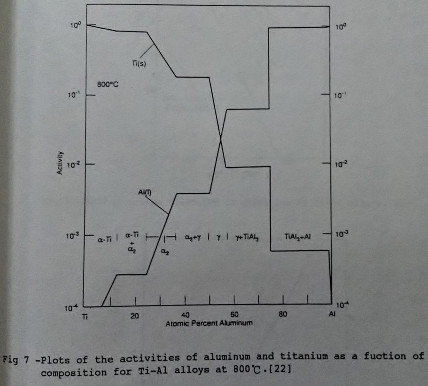 - 鈦鋁金屬高溫氧化時, 鋁的多寡會影響其氧化速率的快慢。一般而言, 抗氧化能力隨鋁含量增加而加強, 研究[3][4]指出鋁增加至63ᵂ/ₒ 以上即可形成連續的氧化鋁保護層。另外就Ti-A1隨成份辦化的活性趨勢來看[22](如圖7), 在Ti3A1和TiA1的區域, 鋁的活性偏低所以表面形成TiO₂氧化層。但在TiA13(約63ᵂ/ₒA1)的區域, 鋁的活性變大, 因此形成A12O3保護層。