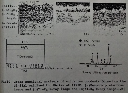氧化層的結構, 在富鈦的Ti-A1合金來說, 最外層大部分是氧化鈦, 往內是TiO₂+A12O3或A12O3的組織, 接近基地(matrix)有一層Ti3A1分布, 詳如圖10所示, 以Ti-38ᵂ/ₒA1為例[24]。