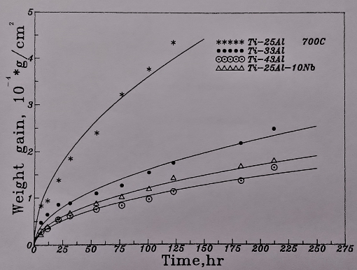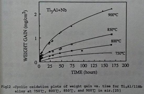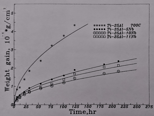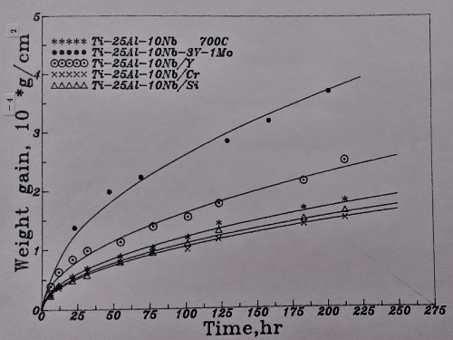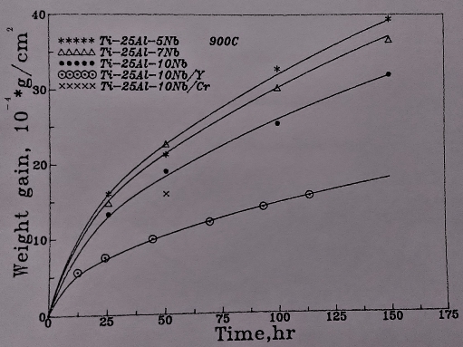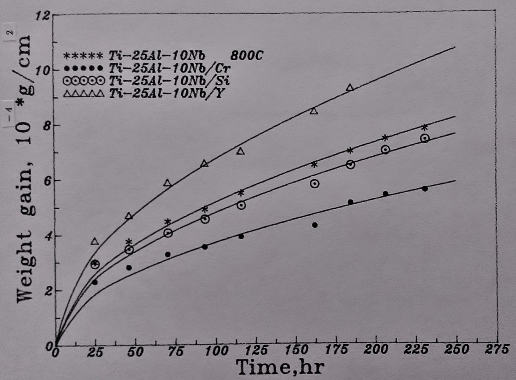 第四元合金元素的添加對氧化速率的影響則如圖24所示, 添加Si和Cr有助於降低氧化速率; 但添加Y的效果卻有負面的影響, 液及加快了氧化的速度。已商業化的Super α₂合金(Ti₆₁Al₂₅Nb₁₀V₃Mo₁)也在同一溫度作比較, 發現其氧化速率最快, 暗示Ti3A1-Nb合金中添加V或Mo會不利於抗氧化能力。