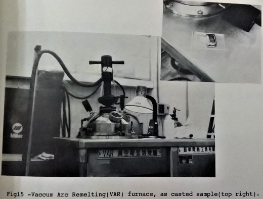 熔煉之前應將生材按照合金成份準備好, 本實驗室以非消耗性鎢極之真空電弧熔解爐來配製合金,如圖15所示。