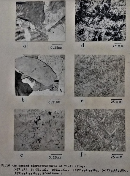 鈦鋁介金屬合金經過真空熔煉後之鑄造組織, 如圖16所示。在鋁含量不同的Ti-Al二元合金裡, 其組織有明顯的差異。Ti3A1合金從晶界延伸出雜亂的層狀組織, 參考Ti-Al的相圖(如圖17), 在1150℃附近有一包析(peritectoid)反應, 可能因此造成如此的鑄造組織。偏化合比的Ti₆₇Al₃₃合金相對地層狀組織則減少很多。Ti₅₇Al₄₃合金的金相是由細而雜亂的板狀(plate)組織所組成。而添加Nb的Ti3A1合金大都為羽毛狀的細化組織。
