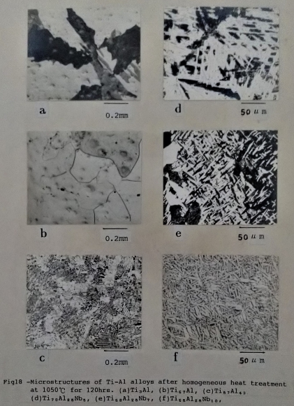 Ti3A1和Ti₆₇Al₃₃合金先前的層狀鑄造組織, 經由均質化處理後已經消失, 取而代之的是粗大的晶粒。Ti₅₇Al₄₃合金的均質化組織, 有類似波來鐵(pearlite)的層狀結構, 根據相圖應該是α₂+γ兩相所組成的組織。