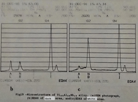 從掃描式電子顯微鏡(SEM)來觀察Ti3A1-Nb合金的組成分布。例如圖19的Ti₆₅Al₂₅Nb₁₀合金, 據EDAX的分析結果, 相片中的白色區域, 鈮含量比平均高出許多, 而鋁及鈦的量較少。灰色或暗色區域的鈮含量則比平均值略低。Kaufman [30]等人也發現β相的鈮含量比較高。同時, 鈮是使鈦鋁合金的高溫β相穩定的元素之一。因此可以確定經過1050℃的均質化處理之後, 所得到的組織是α₂相及殘留的β相所形成的。至於中間相如ω相及ο相則未加以證實。