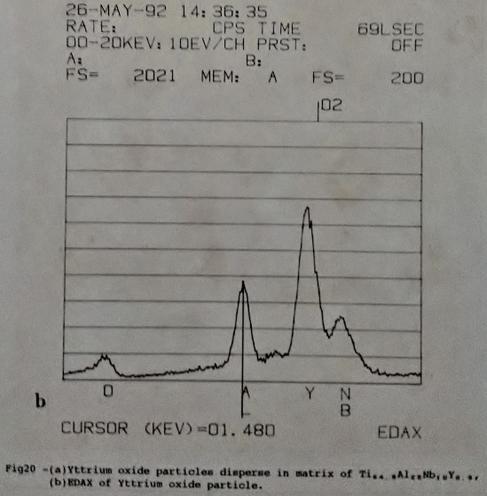 添加Si, Cr等第四元合金元素的Ti3A1-Nb合金與Ti3A1-Nb合金的組織相似。而添加Y的Ti3A1-Nb合金之鑄造組織在SEM下觀察結果顯示Y以氧化物顆粒的方式散布在基地(marix)中(如圖20)。