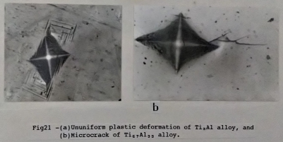 鈦鋁介金屬合金的硬度值如表3所列。經過均質化處理後, 硬度均下降。而在Ti3A1合金的硬度壓痕周圍有不均勻的塑性變形出現。甚至Ti₆₇Al₃₃的成份合金, 其壓痕尖端附近嘿有裂紋產生(如圖21所示)。