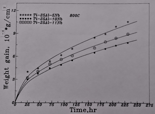 1. Ti3A1介金屬合金因添加Nb而使氧化速率降低, 並且抗氧化性隨Nb添加量的提高而增加。然而鋁的抗氧化能力較鈮更好, 依結果顯示, 鋁含量的多1%可使Ti₆₅Al₂₅Nb₁₀合金的抗氧化能力比Ti₆₅Al₂₄Nb₁₁合金更佳。