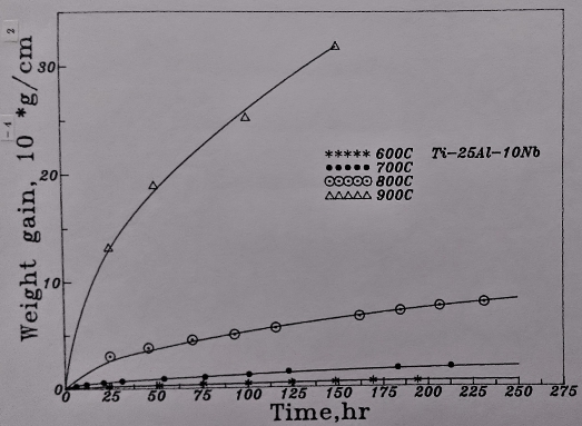 溫度對Ti3A1-Nb介金屬合金的高溫氧化之影響如圖28及29所示。600℃與700℃的氧化速率都很慢, 表示有不錯的抗氧化性。800℃以上氧化速率則急遽上升, 已喪失抗氧化的能力。