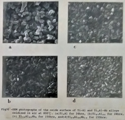 將Ti3A1經過800℃, 24小時的氧化後, 觀察其氧化物係呈現如柱狀晶(純為TiO₂)的生長型態,如圖30-(a)。而且氧化物晶粒之間留存較大的空隙, 有利於氧氣分子向材料內部擴散, 由此也可知Ti3A1合金的抗氧化性不佳。圖30-(b)是Ti₅₇Al₄₃合金在相同的氧化條件下的表面氧化物, 其氧化物分布較緻密。
