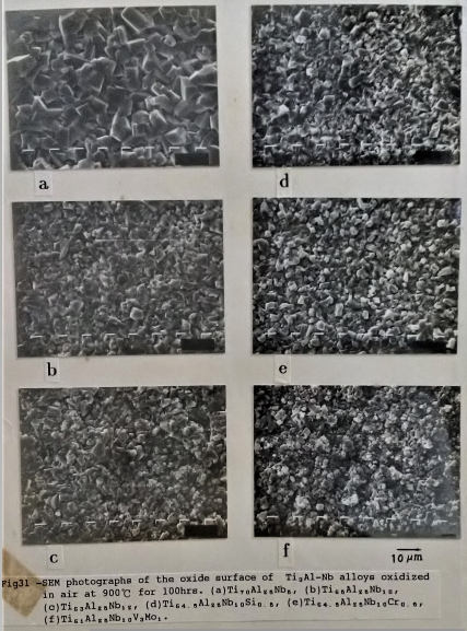 Ti3A1-Nb合金添加微量的Si和Cr可以降低氧化速率。而含Y的Ti3A1-Nb合金必須到900℃才有助於抗氧化能力, Y可使表面氧化層的附著力增強, 不易剝落。