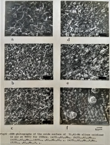 圖30-(c)/(d)分別是經過800℃, 150小時氧化的Ti₇₀Al₂₅Nb₅及Ti₆₅Al₂₅Nb₁₀合金, 其表面氧化物的組織構造與圖30-(a)的Ti3A1合金比較, 顯示Nb有抑制氧化物成長的效果, 且因增加Nb的含量會使氧化物尺寸變小, 顯得更為緻密。