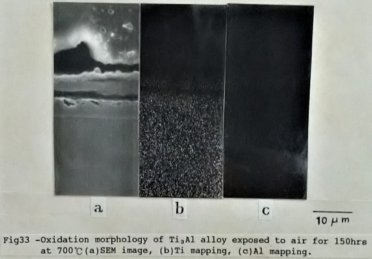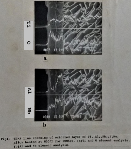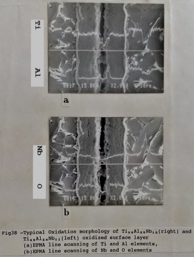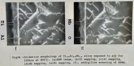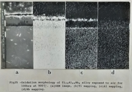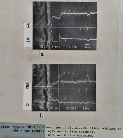 Ti₇₀Al₂₅Nb₅合金經過900℃, 100小時的氧化, 最外層的氧化層幾乎全部為疏鬆的氧化鈦所組成, 緊接著的是氧化鋁層, 在其次為氧化鈦和氧化鈮相混的氧化層, 而氧化層與金屬基地之間有一層極薄的富鋁及鈮的氧化層。如圖35/36所示。而添加10at% Nb的Ti3A1合金, 在相同的氧化條件下, 其氧化層的分布(如圖37), 由外向內依序為: 氧化鋁和氧化鈦的混合層, 其次是氧化鈦與氧化鈮的氧化層, 然後是一層薄薄的氧化鋁層和金屬基地相接。