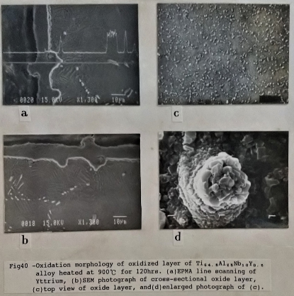 在添加第四元合金元素的Ti3A1-Nb介金屬合金的氧化層結構的研究中, 添加Si與Cr者, 由於添加量甚微, 只能從氧化速率看出對合金的影響。在氧化層組織上與Ti₆₅Al₂₅Nb₁₀合金無多大差別。但是添加Y的Ti3A1-Nb合金則因為Y是以氧化物顆粒散佈於母材中, 因此形成較奇特的氧化層結構。在SEM下觀察, 對照其表面氧化層與截面的氧化層(如圖39/40), 表面的花苞狀氧化物向外突出, 又因氧化釔顆粒會促使氧化層相內成長, 在金屬與氧化層之間形成凹凸不平的平面,
