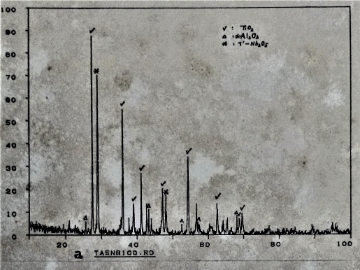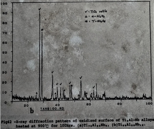 藉X光繞射亦可確定氧化物的組成。圖42是Ti₆₅Al₂₅Nb₁₀的表面氧化物以X光繞射分析, 分析結果得知由TiO₂(Rutile), α-A12O3, γ-Nb₂O₅三種化合物組成氧化層。