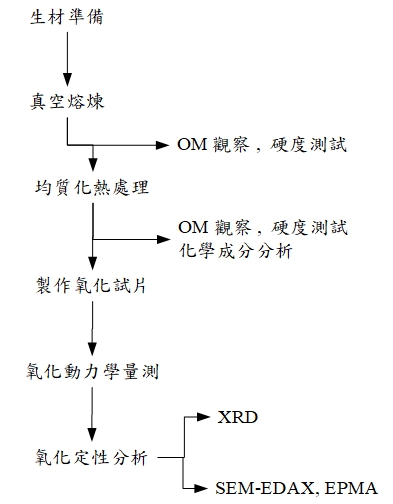 高溫氧化的試片經過均質化熱處理之後, 切割成約10×12×1mm的小試片。氧化測試前, 試片先研磨至1000號砂紙, 再以丙酮及超音波清洗。