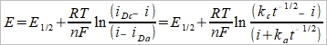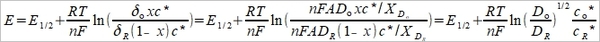 (8), (9)代入(7)→ E=E½+(RT/nF)ln[(δₒxc*-i)/(i+δR(1-x)c*)]