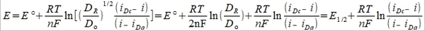 i.e. E½= E°+(RT/2nF)ln(DR/Dₒ)=E°-(RT/2nF)ln(Dₒ/DR)
