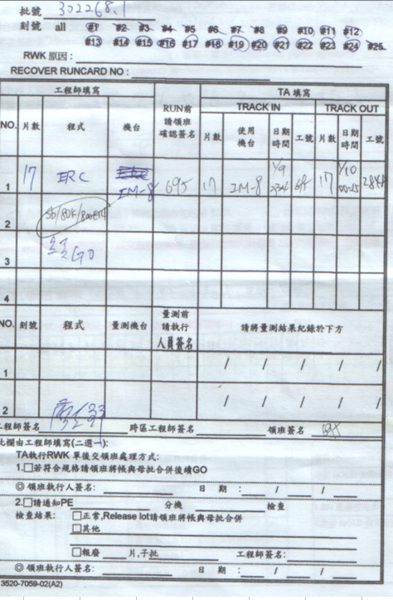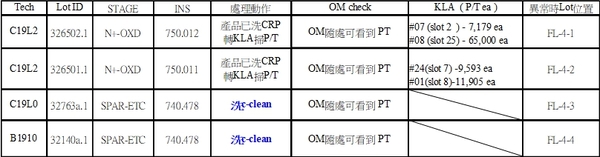 異常原因:PE未遵循RWK流程:252172.1#10 清洗 CRC-3->HF-5->RCA-1->RCA-2 check可去除,but 252172.1當時只有#10進行rwk,其餘wafer PE OM 沒check到水痕pass. 再長完GOX後又被KLA highlight出來.