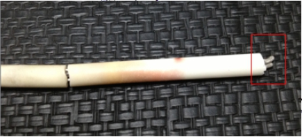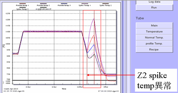 異常原因:SPIKE ZONE2 T/C 老化,造成SPIKE ZONE2抽出來CHECK時,發現一條白金線已有短路現象,但造成此現象, 主因為spike t/c前端陶瓷保護套已斷裂進而造成T/C溫接點, 受後方固定T/C彈片擠壓, 經長時間高溫影響導致T/C異常