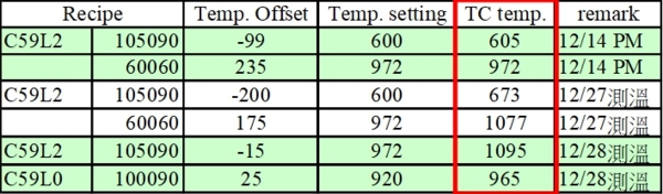 矯正動作: 設備對機台校溫,每次校溫調整值須與baseline之調整值做比較,若超出baseline調整值+/-10C,則需使用備用新品TC wafer作double check,避免校溫異常
