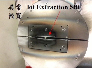 異常原因:RTP-1 Door 密合不佳,EQ確認Door作動端parts狀況,發現為Door 連桿上的止付螺絲經多次作動容易有鬆拖現象,進而導致空氣由Chamber 口進入與產品metal film, 反應呈現的色異現象.