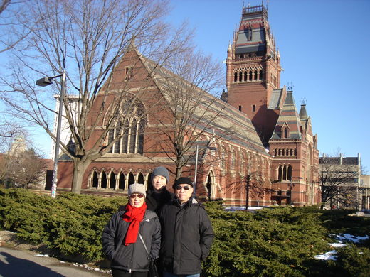 來波士頓得看看哈佛及MIT,哈佛的歷史(1638年創校)比美國(1776年建國)長,先有哈佛再有美國。因而建築典雅,著有英倫古風,學區廣大,古木參天,成為旅遊勝地。高中學校參訪團、亞洲團、韓國團(電視劇愛在哈佛上的景點)熱 鬧了校園,冬雪亦難減其熱度。我們不是什麼團,而是親友團 (小兒為哈佛醫學院講師)。