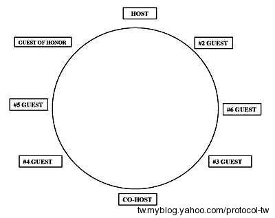兩位主人有位階之高低,第1位主人(Host)居上12點鐘方向,主人右手安排主賓。