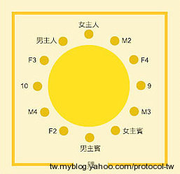 女主人(Hostess)居上12點鐘方向,主人(Host)坐於下方6點中位置。
